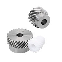 Helical gear made from SUS304 for excellent corrosion resistance. As helix angle is 45°, can be used for both helical gear (parallel axis) and screw gear (crossed axis). Directly mountable tapped in 2 points, machined product also available.