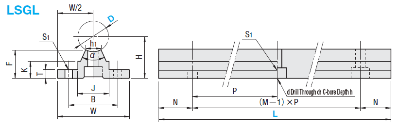 | Part Number | L Selection | H | W | F | T | B | K | J | h1 | α | S1 | P | d | d1 | h | |||||