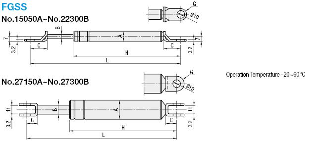 Gas spring that is a swivel type in mounting direction. You can choose the stroke from 50 to 300 mm.