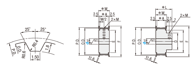 Tooth groove dimensions slightly vary according to the number of teeth. (Pitch: 5.0mm)