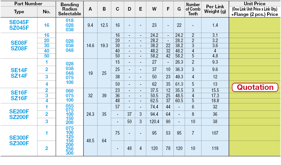 | Part Number | Bending Radius | No. of Links | H | H1 | HF | K | P | B | ℓ | |