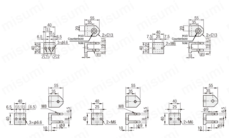 HBLTBD40(One each of ② and ③ will be delivered for an order of 1 unit)1) Frame side mounting type②Frame cross section mounting type③Frame cross section mounting type