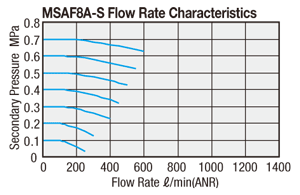 This graph shows that when the primary pressure is constant, the secondary set pressure drops according to the flow rate used.
