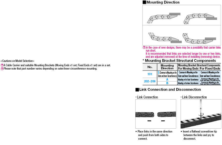 | Cable Carrier + Mounting Bracket | MHPKS | Nylon 6 + Glass Fiber 20% (Operating Temperature -10~80°C) Flammability Standard UL94-HB Equivalent | SPCC | Trivalent Bright Chromate Plating |