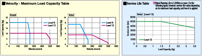 1. The Service life in the vertical use may vary depending on the load capacity. Please refer to the "Service Life Table." 2. The maximum velocities may vary depending on the load capacity. Please refer to the "Velocity - Maximum Load Capacity Table."