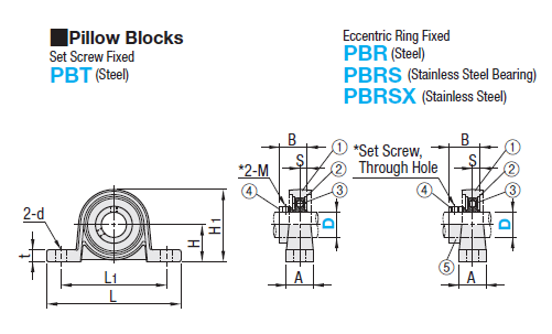 [Features]This is a lubrication-free pillow type ball bearing unit. 2 types are available: set screw fixed type and eccentric ring fixed type.