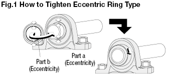 | Eccentric Ring Fixed | •Dissociate the centers of the convex outer surface at the end of the bearing inner race (part a) and the concave inner surface of the eccentric ring (part b), connect the shaft and the inner ring by forming a wedge on the circumference (Refer to Fig. 1). •Also, there is a set screw and a hole each (at the angle of 90°) on the end face of eccentric ring, which helps to prevent loosening by using the set screw as well as tightening as described above. •The D hole is for inserting a small diameter rod when loosening the connection. |