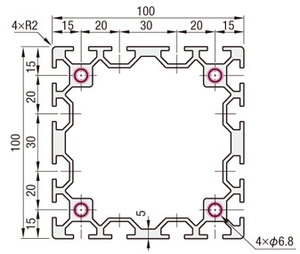 [ ! ]If you request additional tapped holes, the processing will be performed in the red circled areas on the aluminumextrusion outline drawing.