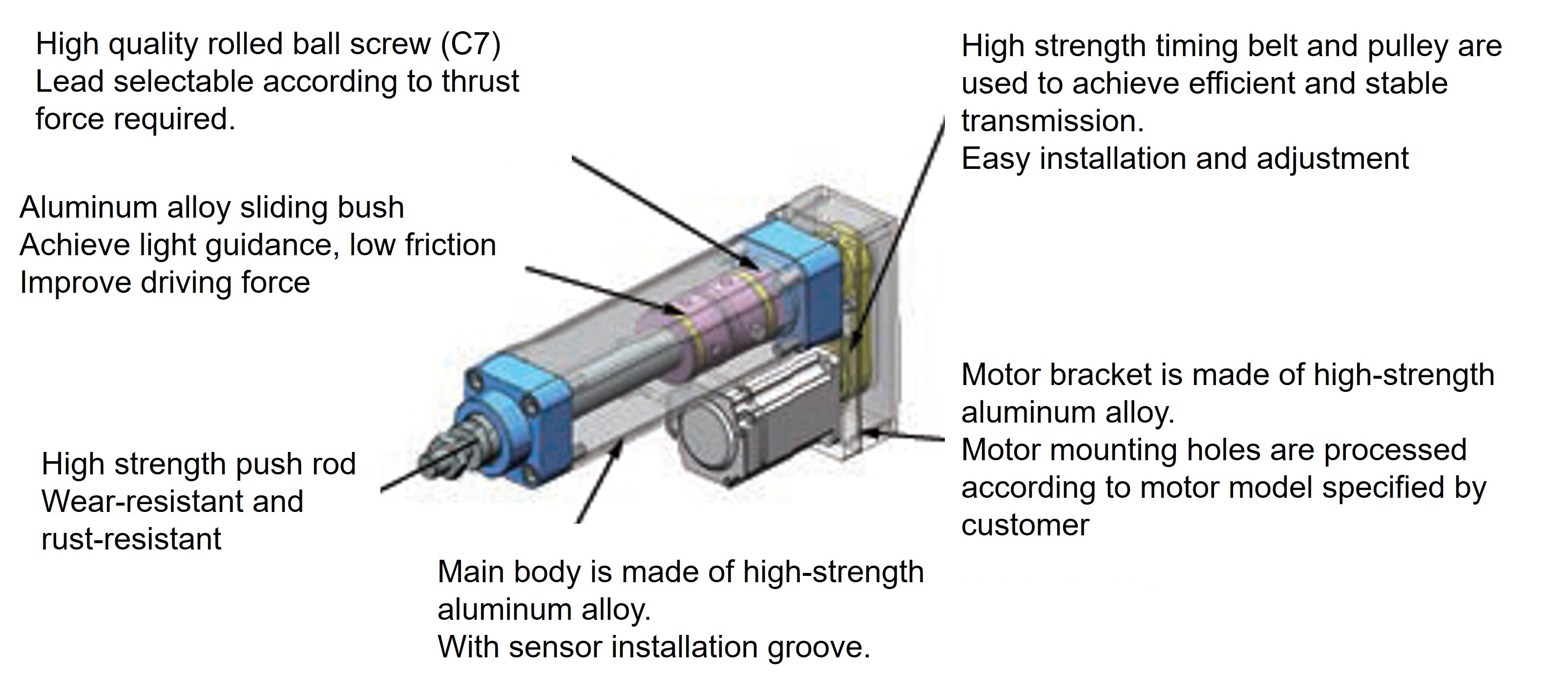 Compared with traditional hydraulic and pneumatic cylinder, it has the characteristis of energy saving, space-saving design, low noise, pollution fee and low maintenance cost, achieving the goal of overall cost reduction.