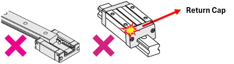 ① MISUMI Linear Guides are equipped with retainers, so steel balls are not easily dislodged when removing the sliding block. However, if the block is removed from the rail at high speed or inserted at an angle, balls may dislodge. Please disassemble and reassemble the block carefully.