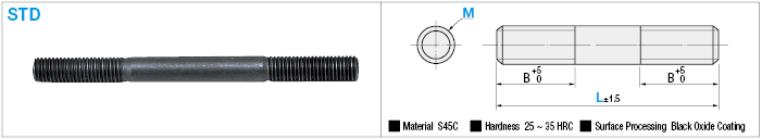 A stud bolt with a hardness of 25 to 35 HRC whose material is S45C and surface is alkaline blackened.