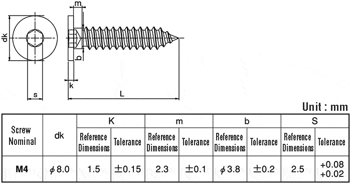 It is an ultra-thin type flat head shape. The pitch of the screw is comparatively coarse and the outside diameter has a positive tolerance.