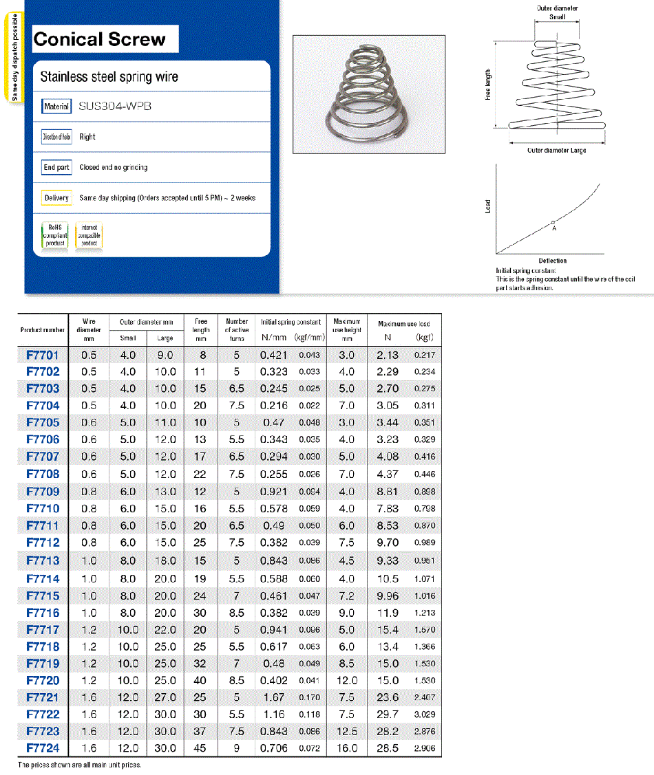 Conical spring with wire diameter of 0.5 to 1.6 mm.