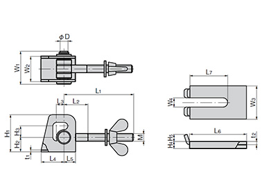 | Product No. SUS304 | L1 | L2 | L3 | L4 | L5 | L6 | L7 | W1 | W2 | W3 | W4 | H1 | H2 | H3 | H4 | H5 | SUS304 | SPCC | øD | M | ||
