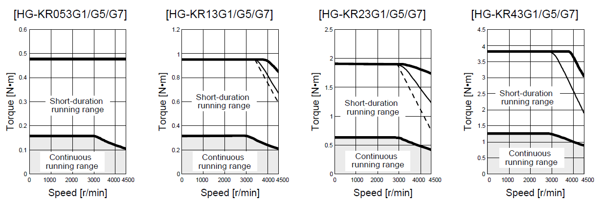 The torque characteristics shown in the following diagrams are for the servo motor alone. When the input