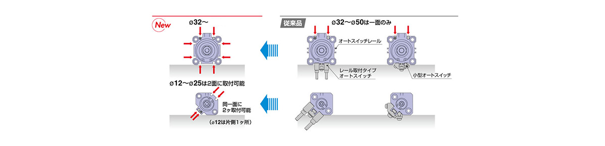 · Remodeled with a new body for more flexibility. Small auto switches can be mounted on the 4 surfaces.