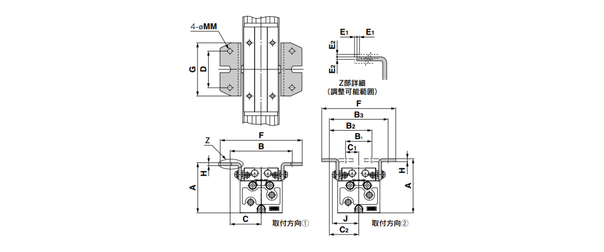 | Model | Compatible cylinders | Common | Mounting direction (1) | Mounting direction (2) | Adjustable range | ||||||||||||||