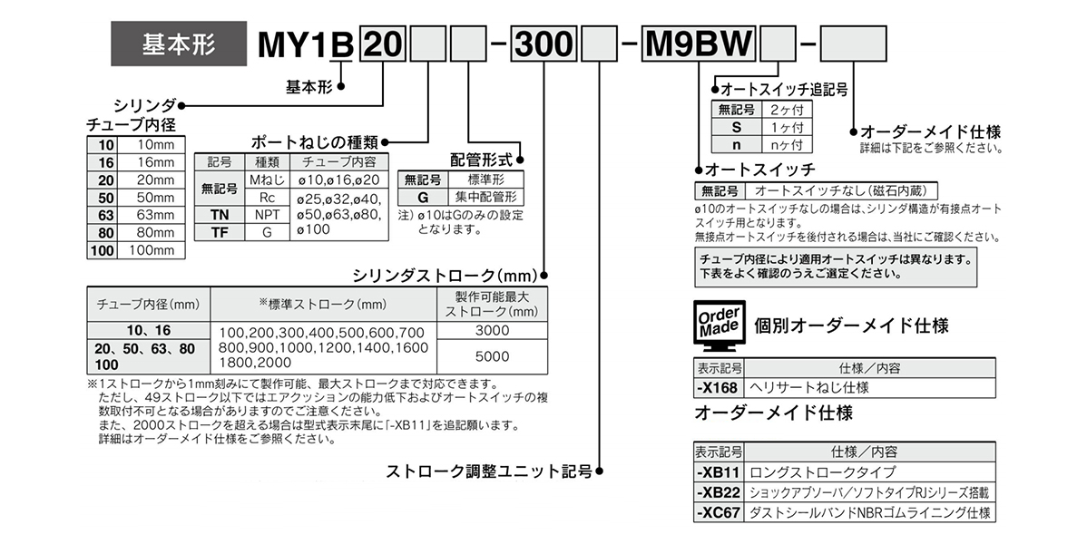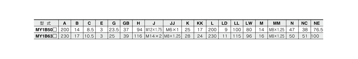 Specifications of Mechanical Joint Type Rodless Cylinder, Basic Type MY1B Series