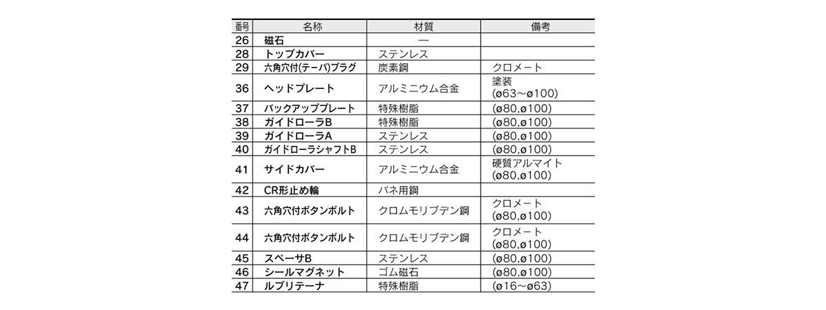 | Tube inner diameter (mm) | Basic weight | Extra weight per 50 strokes | Weight of Moving Parts | Side support Bracket weight (Per pair) | Stroke adjustment unit weight (Per unit) | ||