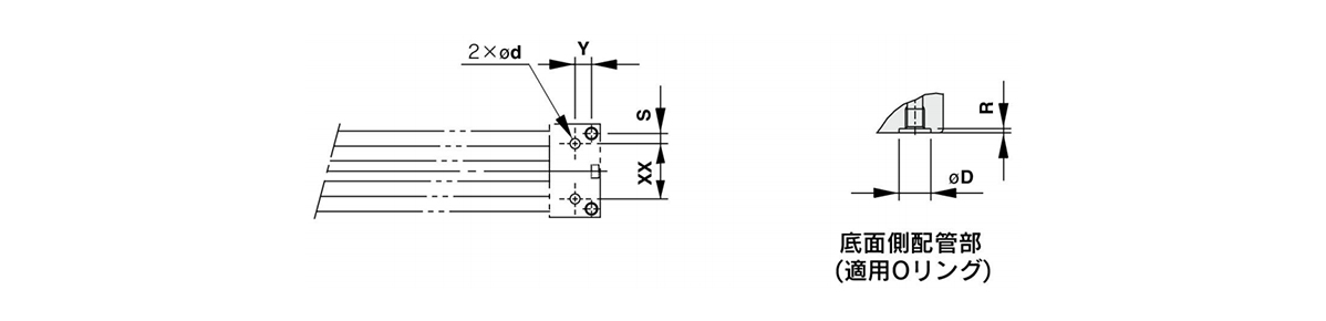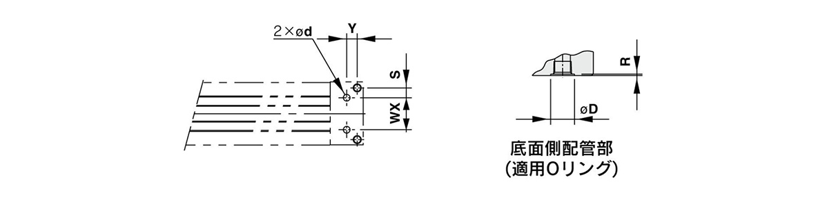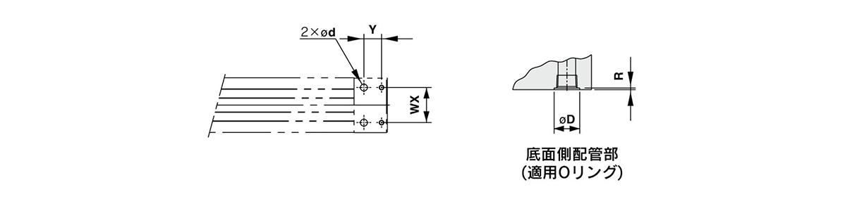 Dimensional drawing of MY1B16□/MY1B20 piping hole for centralized bottom piping (right: Bottom side piping (Applicable O-ring)