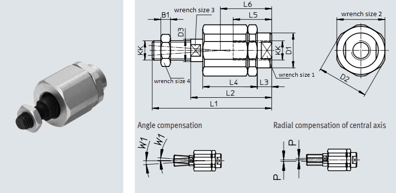 | KK | wrench size 1 | wrench size 2 | wrench size 3 | wrench size 4 | Max. permissible tensile and compressive load [N] | Axial play [mm] | Radial compensation P [mm] | Weight [g] |