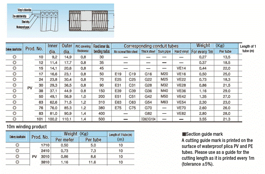 Vinyl-covered metal flexible conduit for outdoor use which complies with JIS C 8309 standards. Vinyl sheath is weather and water resistant.
