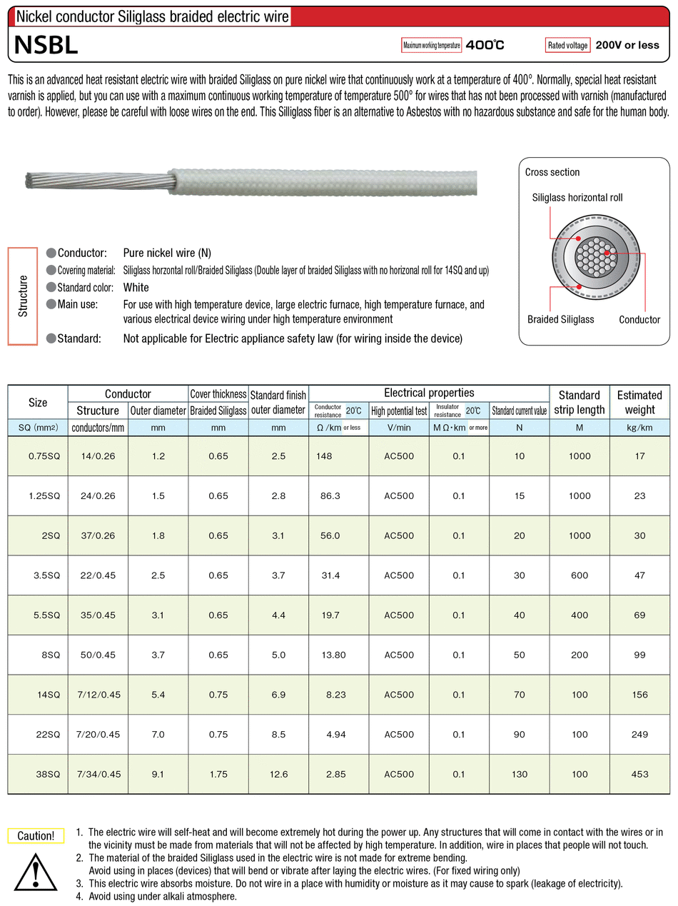 • Super heat resistant wire enabling operating temperature at 400°C, providing silica glass braiding over pure nickel conductor.