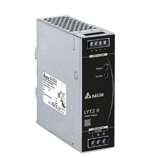 Delta’s LYTE II DIN rail power supply series is designed for cost sensitive users who need to fulfill essential features needed for many general industrial applications, without compromising on quality and reliability. The convection-cooled LYTE II series will operate full power from -30°C to +50°C, then de-rating up to +70°C at 230 Vac. It can operate in constant current mode, making it suitable for inductive and capacitive loads.The product is certified according to safety standards IEC/EN/UL 62368-1. Electromagnetic radiated and conducted emissions are compliant to heavy industrial EN 61000-6-4 Class B Emission standard and EN 61000-6-2 Immunity standard. The product comply with environmental protection requirements as per RoHS Directive.