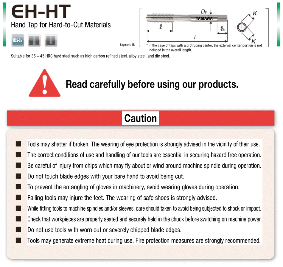 ■ The EH-HT tap is suitable for tapping high hardness material from 35 to 45 HRC like high carbon steel, alloy steel forging,thermal refined material and metal mold material.