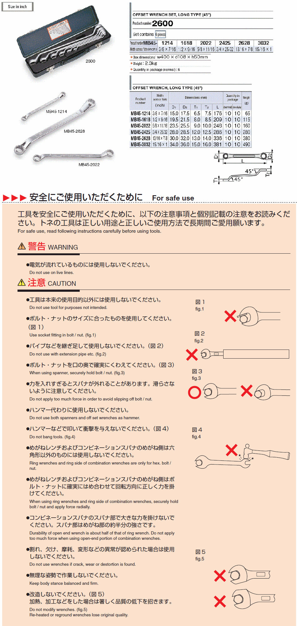 · For maintenance and assembly of devices using imperial-size bolts, such as vehicles from outside Japan, motorcycles, and other imported machinery.