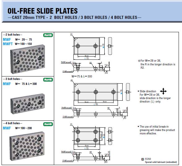 นี่คือ แผ่นเพลท สไลด์ไร้น้ำมันชนิด เหล็กหล่อ ขนาด 20 มม. คุณสามารถเลือกได้ระหว่างประเภท สลักเกลียว 2 รูและ 4 รู วัสดุ เป็น เหล็กหล่อเทา ขนาด ñ ของ MWF75-75 คือ 25