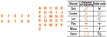 | รหัสสินค้า | อักขระการแกะสลัก (1 ถึง 3 ตัวอักษร / ตัวอักษรที่พิมพ์เป็นสีน้ำเงินเพื่อบ่งบอก) | ||||