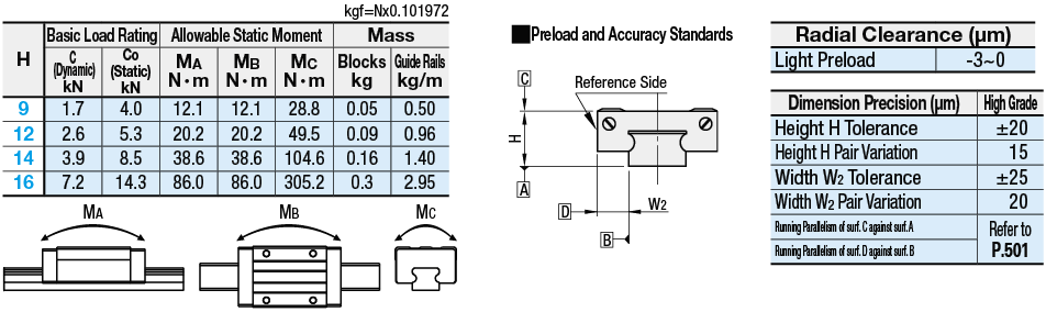 [ ! ] ไม่รับประกันระยะห่างระหว่างเม็ดลูกกลิ้งและความแม่นยำหากบล็อคและรางของชนิดพรีโหลดเบาถูกเปลี่ยนจากส่วนประกอบดั้งเดิมในชุด