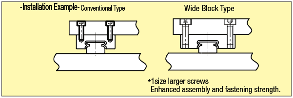 ชนิดบล็อคกว้าง ของ สเปค ต้นฉบับของ MISUMI ขนาด สกรู ที่ใหญ่ขึ้นทำให้มีความแข็งแรงในการยึดเพิ่มขึ้นเมื่อเทียบกับผลิตภัณฑ์ มาตรฐาน ผลิตโดย SURUGA Production Platform, Co., Ltd. SURUGA Production Platform ได้พัฒนาธุรกิจบนเทคโนโลยีการผลิตที่แม่นยำ ทำให้สามารถมอบความแม่นยำในระดับไมครอนได้