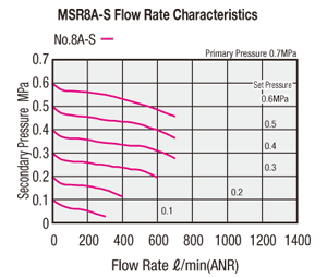 กราฟนี้แสดงให้เห็นว่า เมื่อแรงดันขั้นต้นคงที่ที่ 0.7 MPa แรงดันรองจะลดลงตามอัตราการไหลที่ใช้