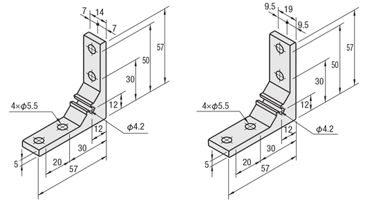 | ฉากยึดแบบมีส่วนยื่น | ・ฉากยึดแบบมีส่วนยื่นผลิตจากวัสดุ ADC12 โดยใช้แม่พิมพ์ มักจะไม่ผ่านการอโนไดซ์ และราคาถูกกว่าฉากยึดแบบรีดขึ้นรูปที่มีขนาดเท่ากัน ・ส่วนยื่นสามารถทำหน้าที่เป็นตัวกันหมุนขณะขันสกรู ทำให้งานติดตั้งทำได้ง่าย ・มีหลากหลายรุ่นที่มีฟังก์ชันเพิ่มเติมให้เลือกใช้งาน |