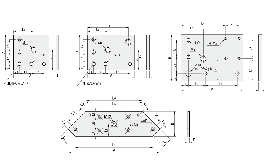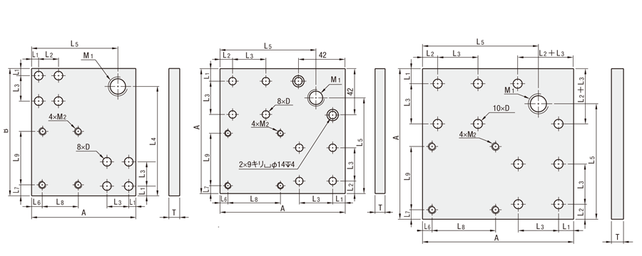 | ประเภทเพลท | รุ่น | ฐานสำหรับการอัดขึ้นรูปอะลูมิเนียมที่รองรับได้ | A | B | T | M2 | D | L1 | L2 | L3 | L4 | L5 | L6 | L7 | L8 | L9 | น้ำหนัก (กก.) | ||