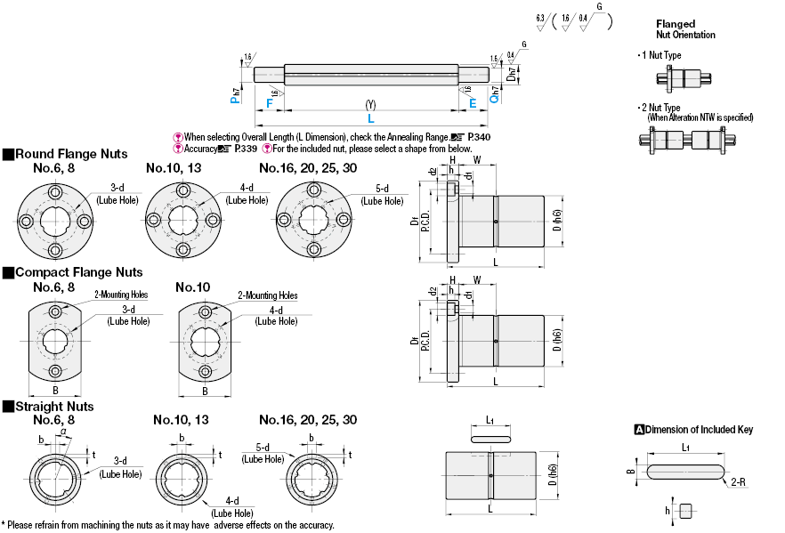 | ปลายทั้งสองด้านแบบขั้นบันได | เพลาสไปลน์[ M ]นัทเทียบเท่า SUJ2 [M]เทียบเท่า SCM415[H]ความแข็ง : 58HRC ~ | เพลาสไปลน์, นัท[M]วัสดุ: เทียบเท่า SUS440C [H]ความแข็ง: 55HRC ~ |