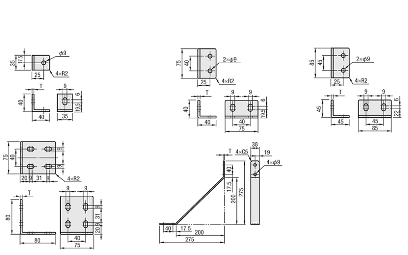 | รุ่นฉากยึดโลหะ | น้ำหนัก (ก.) | T | สลักเกลียวและน็อตที่ใช้ได้ | |||