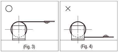 6. เมื่อใช้ขายึด ให้จัดวางให้อยู่ในตำแหน่งตามที่แสดงในรูปที่ 3 การจัดวางให้อยู่ในตำแหน่งตามที่แสดงในรูปที่ 4 อาจทำให้สปริงสัมผัสกับพื้นผิวติดตั้งของขายึดได้ สิ่งนี้อาจทำให้สิ่งแปลกปลอม เช่น ฝุ่น เข้าไปข้างใน ซึ่งอาจทำให้สปริงเสื่อมสภาพได้
