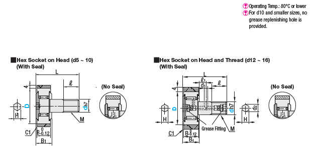 | รูหกเหลี่ยมบนหัว (d5 ถึง 10) | รูหกเหลี่ยมบนหัวและเกลียว (d12 ถึง 16) | |||||