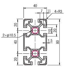 อลูมิเนียมโปรไฟล์ซีรีส์ 8 สี่เหลี่ยม 40x80 มม. 4 ด้าน อลูมิเนียม A6N01SS-T5