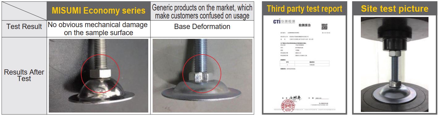 โหลดไฟฟ้า ของ ขาตั้งปรับระดับ ระดับซีรีส์ MISUMI ความคุ้มค่า ได้รับการระบุไว้อย่างชัดเจน และรับประกันโดยการทดสอบของบุคคลที่สามเพื่อการใช้งานที่มั่นใจได้มากขึ้น ผลการทดสอบ น้ำหนักบรรทุกที่ยอมให้ ตาม มาตรฐาน GB