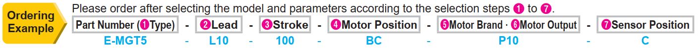 | E-MGT5 | 5 | 50 to 800 | BC (มอเตอร์ไดเร็กต์) BM (ด้านล่างลง) BL (พับซ้าย) BR (พับขวา) | M (มิตซูบิชิ) P (พานาโซนิค) Y (ยาสกาว่า) T (Delta อิเล็กทรอนิกส์) Z (จัดเตรียมโดยลูกค้า) | 10 (100W) | C (ด้านมอเตอร์) D (มอเตอร์ฝั่งตรงข้าม) | ±0.01 | 30 | 10 | 250 | 341 |