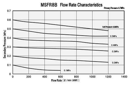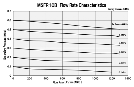 กราฟนี้แสดงให้เห็นว่าเมื่อ ความดัน หลักคงที่ที่ 0.7 MPa ความดัน คลองเลื่อย ที่สองจะลดลงตาม อัตราการไหล ที่ใช้