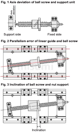 สาเหตุที่ บอลสกรู โหลดไฟฟ้า ตลับลูกปืนเรเดียล และ โหลดไฟฟ้า โมเมนต์เป็นความเบี่ยงเบนของ แกน และข้อผิดพลาด ความขนาน ของชิ้นส่วนโดยรอบ ดังนั้นจึงจำเป็นต้อง การออกแบบ และประกอบชิ้นส่วนต่อพ่วงของ บอลสกรู ให้ถูกต้อง เพื่อป้องกันข้อผิดพลาด