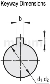 ขนาดเส้นผ่านศูนย์กลางรูเพลา d1· d2 | b (ความกว้างรูสลัก, รูกุญแจ) | t ความลึกรูสลัก, รูกุญแจ | ขนาดเกลียวกุญแจ b × h | |
