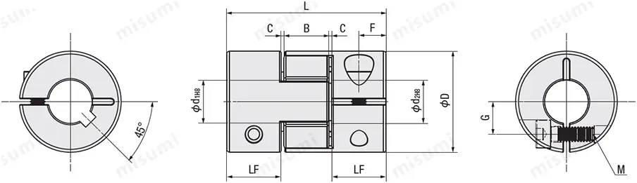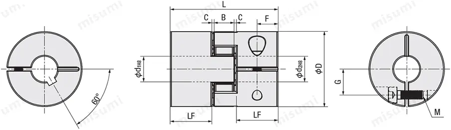 | ชนิด | การเลือก d1และ d2 (แต่ d1≤ d2) | LF | B | C | F | รูใน ⌀d | สลักเกลียวล็อค (M) | G | |||||||||||||||||