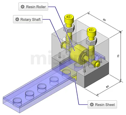 จิ๊กสำหรับประกอบอินเสิร์ตเพื่อฝังลงในชิ้นงานยางและอลูมิเนียม โดยช่วยให้ส่วนที่ยื่นออกมาของยางสามารถสอดเข้าไปในส่วนเว้าของชิ้นงานอีกชิ้นหนึ่งได้ สามารถปรับโหลดไฟฟ้าได้โดยใช้สลักเกลียวและขันแน่นด้วยลูกกลิ้ง