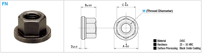 น็อตหน้าแปลนที่มีความแข็ง 25 ถึง 35 HRC ซึ่งมีวัสดุเป็น S45C และพื้นผิวเป็นด่างดำ